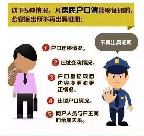 根据该《意见》,对于下列 5类事项,凡居民户口簿能够证明的,有关单位及其工作人员应予认可,公安派出所不再出具证明: