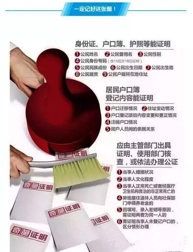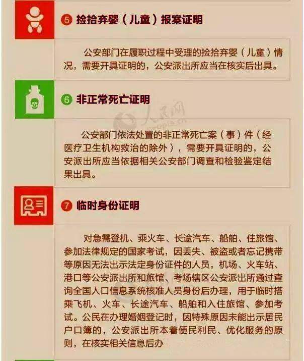 根据该《意见》,中华人民共和国居民户口簿、居民身份证、护照是公民法定身份证件,具有证明公民身份的法律效力。对于居民户口簿、居民身份证、护照完全能够证明的以下9类事项,有关单位及其工作人员应予认可,公安派出所不再出具证明: